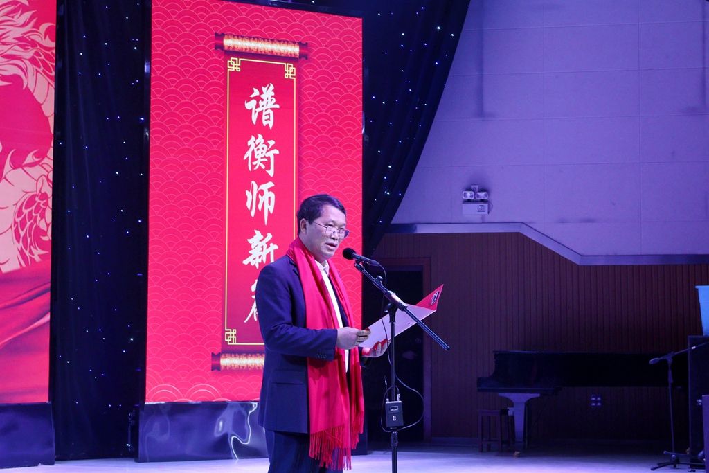 晚会在民乐合奏《江南情韵》激昂婉转、悠扬动听的音调中拉开序幕。陈晓飞致新年献词,向全校师生致以节日的问候和新年的祝福。他回顾了学校这一年来的付出与收获,对全校师生的辛勤付出和无私奉献表示衷心的感谢和崇高的敬意。他表示新的一年,新的征程,新的起点,他希望全校师生共同传承百年校史的红色基因,坚守百年校史的师范初心,凝心聚力,开拓进取,用新的辉煌业绩推进学校高质量发展,继续朝着高水平师范大学的宏伟目标奋勇前进。
