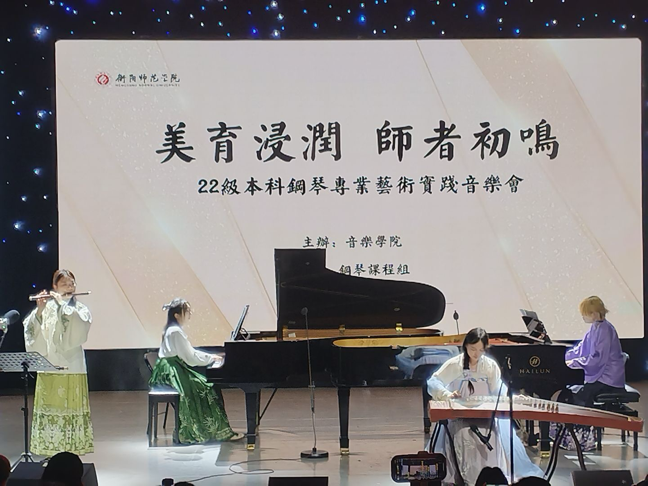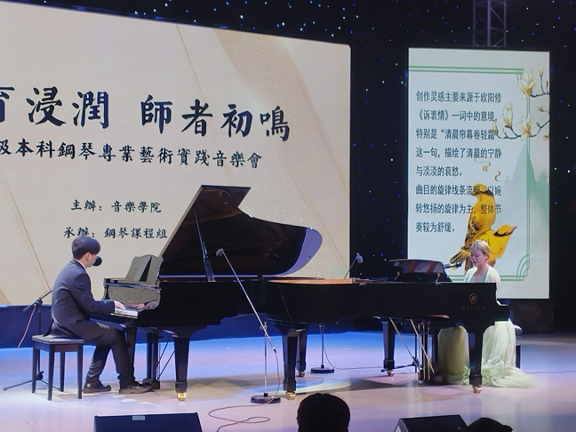 音乐会表演形式丰富多样,涵盖钢琴独奏、钢琴协作以及自弹自唱等。采取演奏与作品分析相结合,理论与实践融为一体,深度解析每段音乐背后的故事与内涵,使在场观众领略中国钢琴作品中流淌的文化自信,感受多元音乐文化的交融碰撞。在音乐的浸润中厚植家国情怀,涵养精神品格。